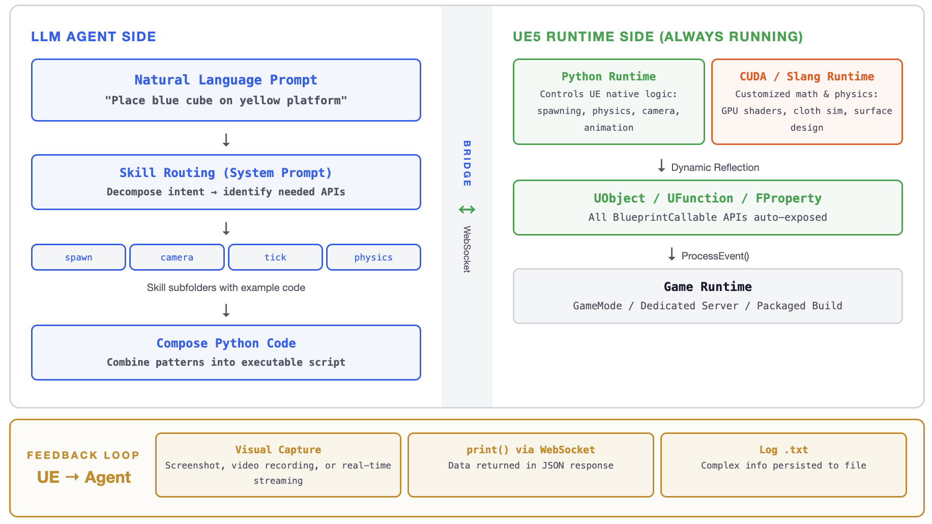 Agent–Engine bridge: LLM → WebSocket → Python + CUDA/Slang → UE5