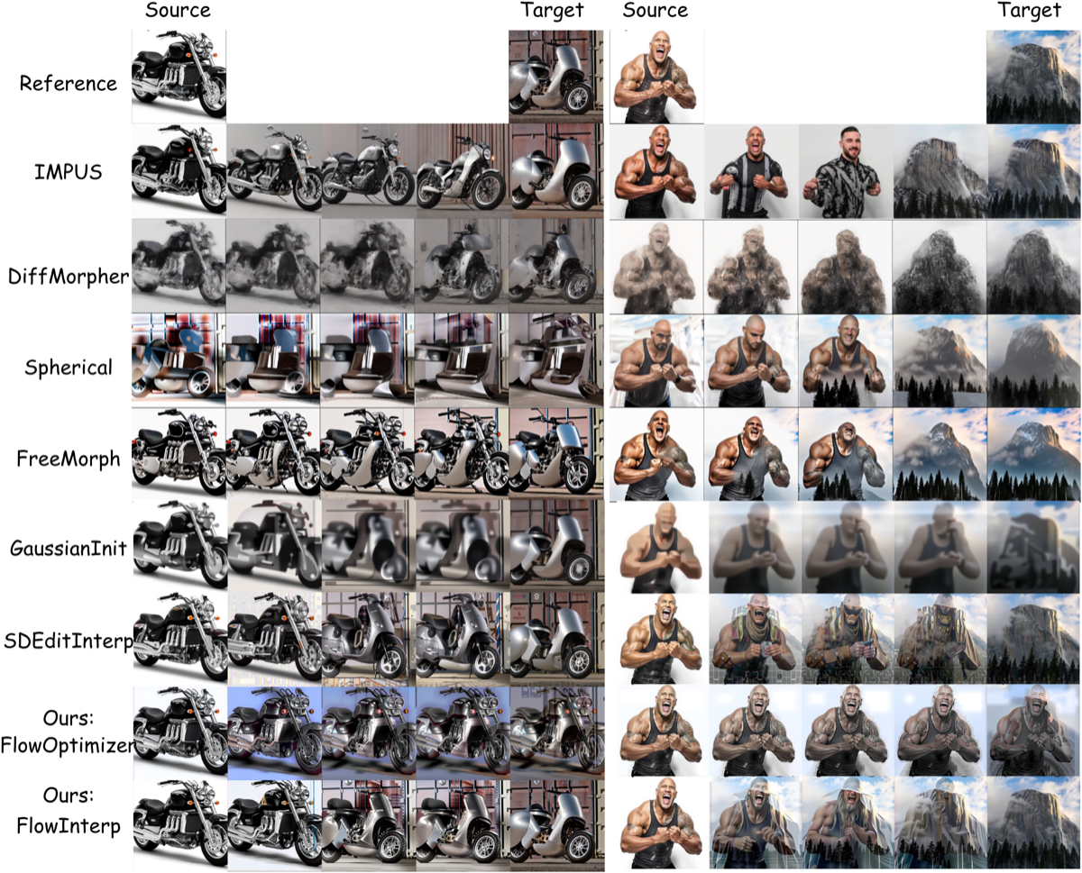 vs RF-Inversion, DiffMorpher, SDEditInterp, FreeMorph — ours preserves geometry with smoother transitions