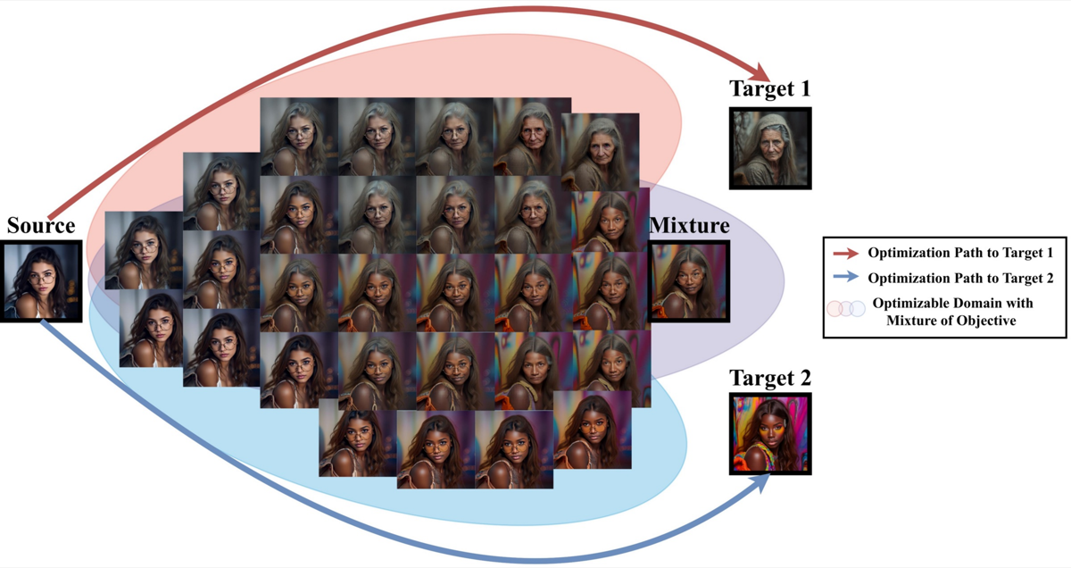 Composite loss: blend identity + expression + age + style simultaneously by combining multiple target losses. Each target contributes a gradient toward a different attribute — the optimization finds a balanced point.