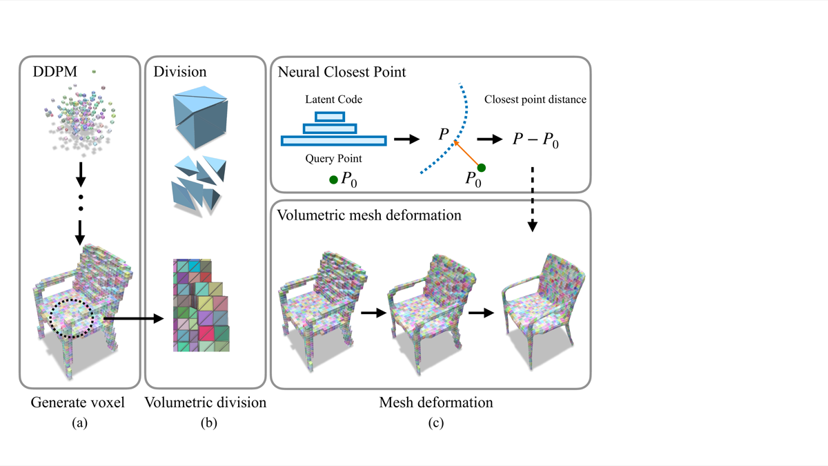Voxel DDPM → volumetric division → neural surface deformation