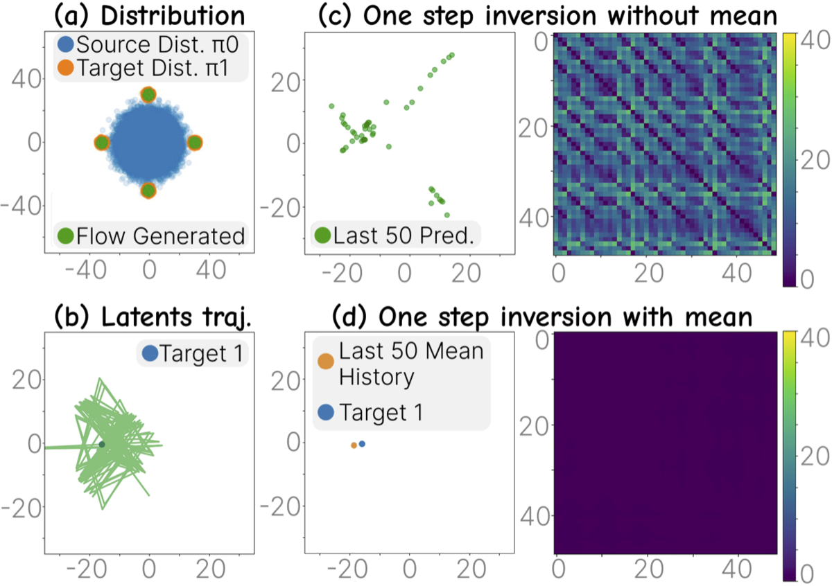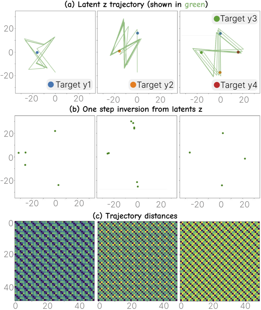 Trained flow matching on toy distribution. Columns: 1, 2, 4 input images. Row (a): inverted latents. Row (b): one-step predictions. Row (c): trajectory distances — more inputs → more regular oscillation.