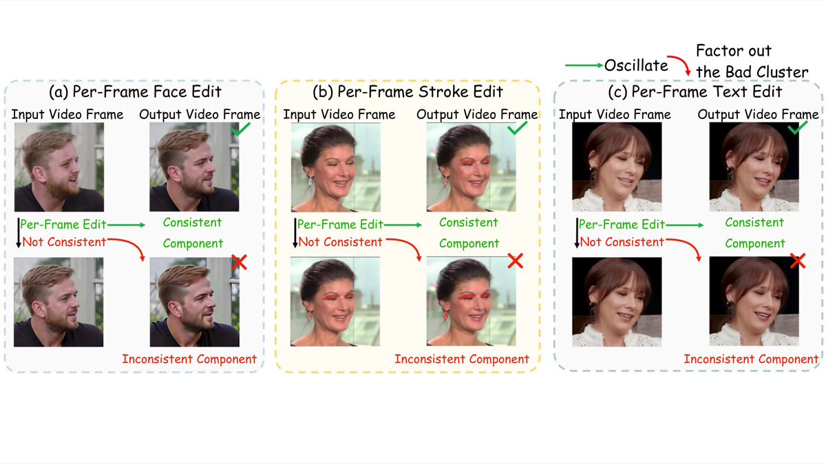 Better T-LPIPS and CLIP consistency. Any per-frame editor → video editor, training-free.