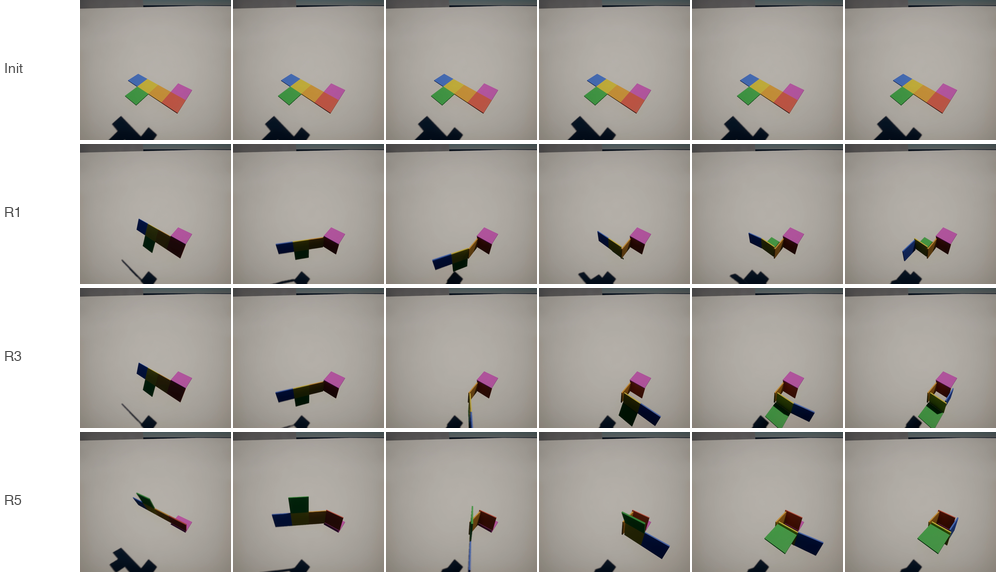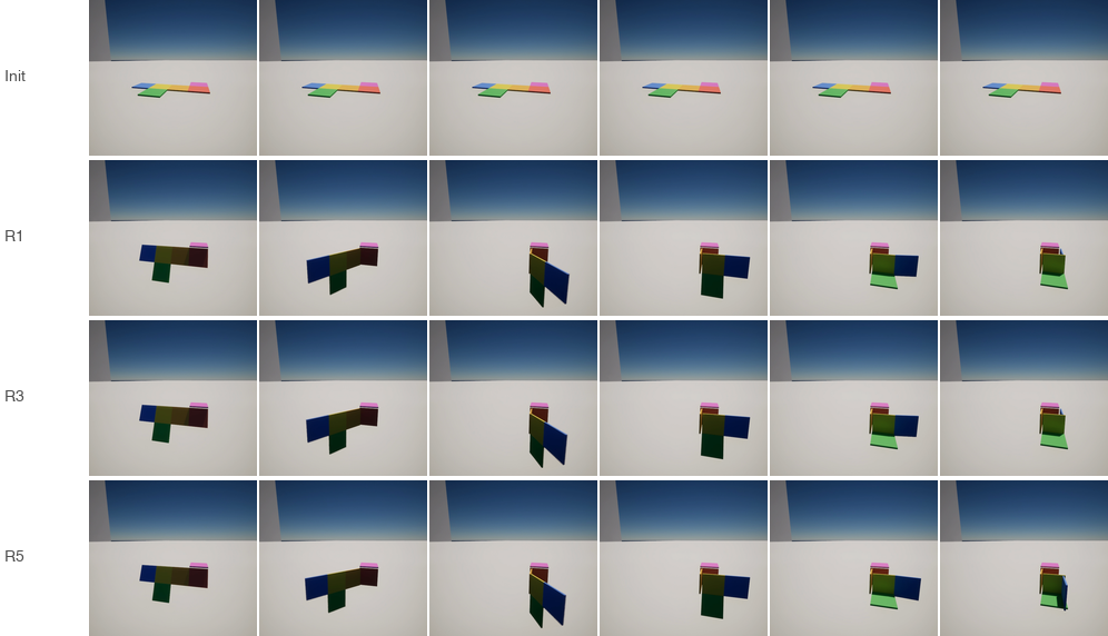 Interactive 3D tasks with deterministic verification. Agent observes, acts, receives feedback in a closed loop.