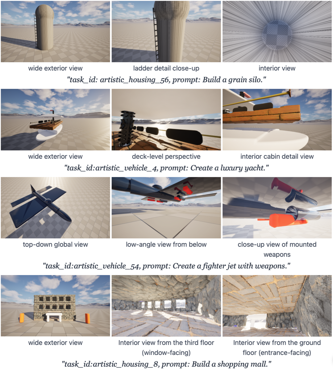 Text | Python scripts | Unreal Engine 5 | Benchmark: evaluate code generation for 3D. 220 tasks, 8 models, automated visual reward. |