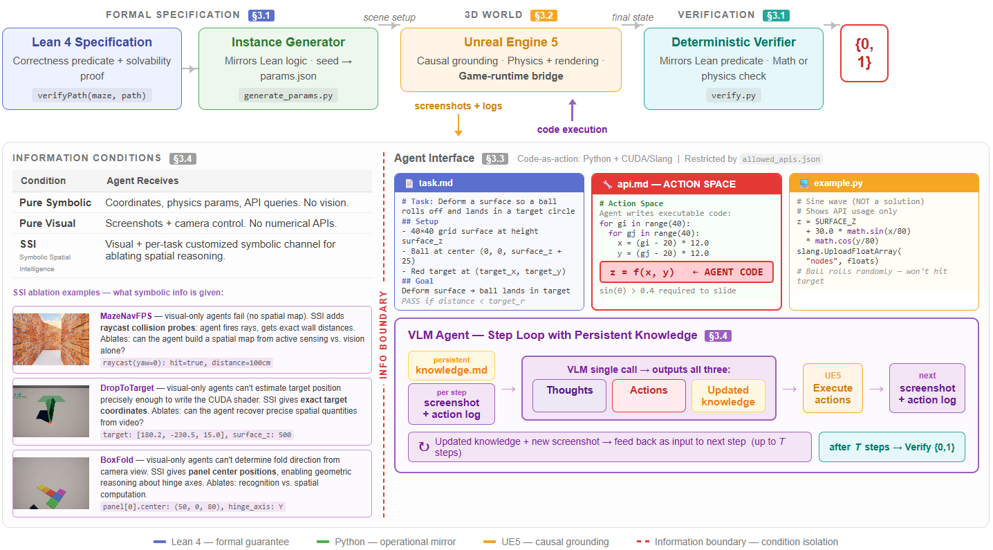 Lean 4 spec (proves solvability) → parametric instance generation → interactive UE5 environment → agent closed loop → deterministic pass/fail verifier.