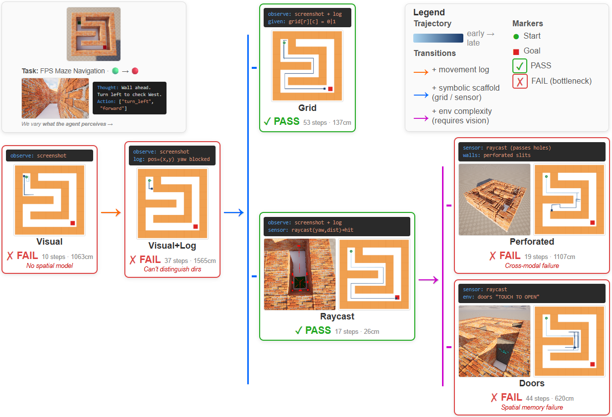 Same maze task under controlled input conditions. Structured (raycast) passes; visual-only fails. This controlled comparison isolates perception as the bottleneck.